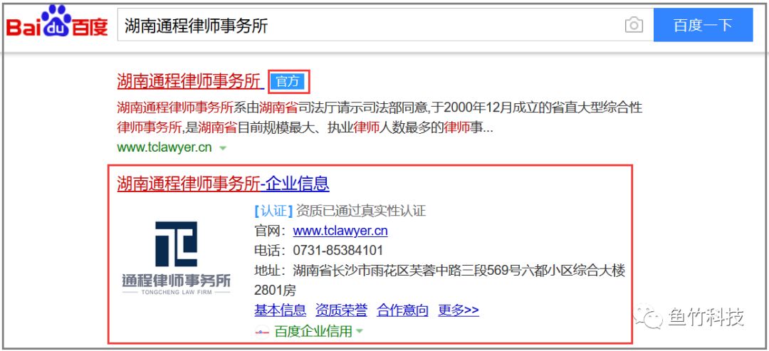 2、如下圖所示,百度企業名片可以實現一件撥號,網民無需進入網站就可以直接撥打電話聯系上律所;