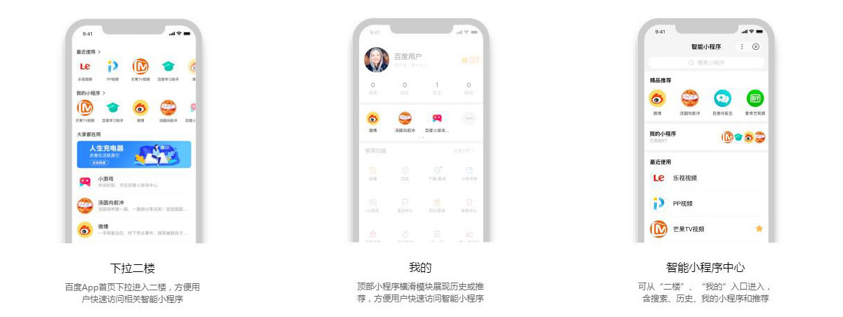 百度App首頁下拉進入二樓,方便用戶快速訪問相關(guān)智能小程序。頂部小程序橫滑模塊展現(xiàn)歷史或推薦,方便用戶快速訪問智能小程序。可從“二樓”、“我的”入口進入,含搜索、歷史、我的小程序和推薦。